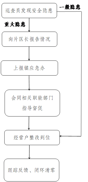 對于巡查發現的重大隱患,安全巡查員應立即向片區組長報告,片區組長第一時間上報應急辦,應急辦會同相關職能部門督促整改,隱患整改后完成閉環。